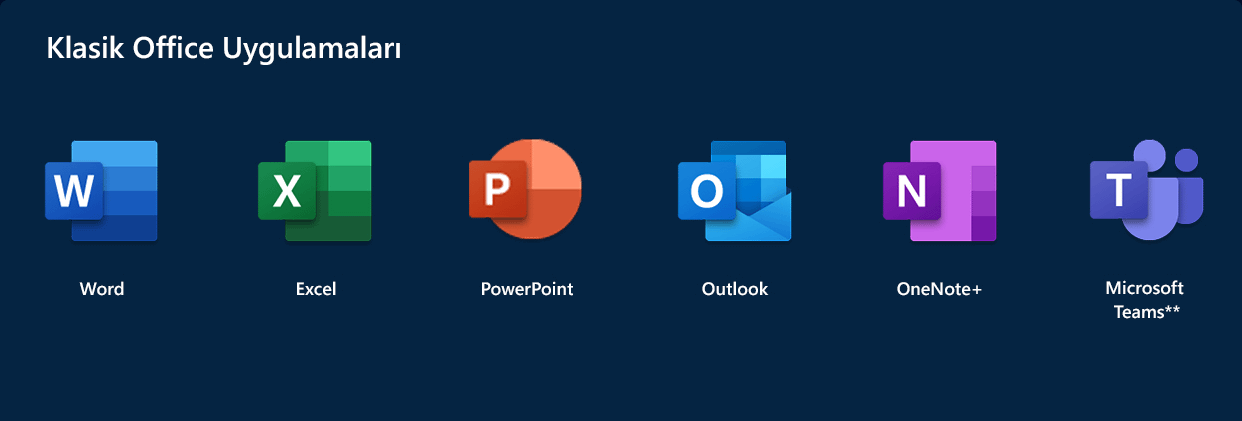 Bildiğiniz Office artık daha modern. Office Ev ve İş 2021, işinizi yakından tanıdığınız üretkenlik araçlarıyla yönetmenize yardımcı olur. Outlook, Word, Excel, PowerPoint ve OneNote'un† klasik sürümlerini içerir. Evdeki veya iş yerindeki 1 PC'de ya da Mac'te kullanılmak üzere tek seferlik satın alma içerir. Microsoft Teams'in ücretsiz sürümünde ücretsiz sohbet, arama uygulaması, toplantı planlama, kullanıcı başına 2 GB dosya depolama alanı ve konuk erişimi gibi özellikler bulunmaktadır.