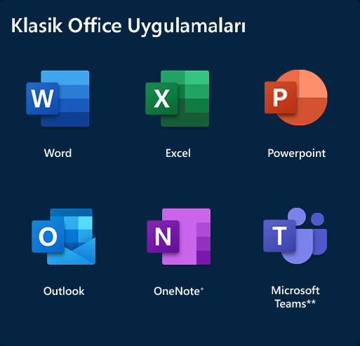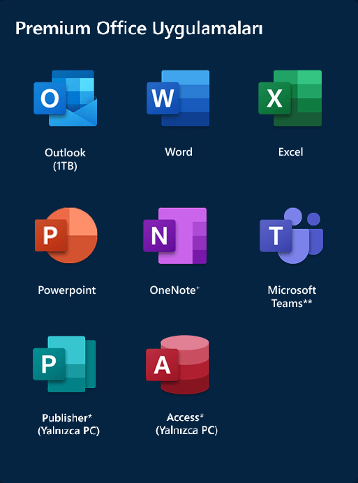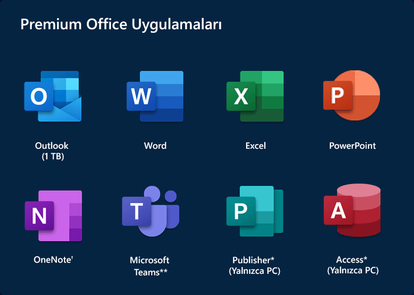 ‡ Uygulama kullanılabilirliği cihaza/dile göre değişiklik gösterir. Windows 11 ve macOS'un uyumlu sürümleri ve diğer özellik gereksinimleri için office.com/systemrequirements adresine gidin.